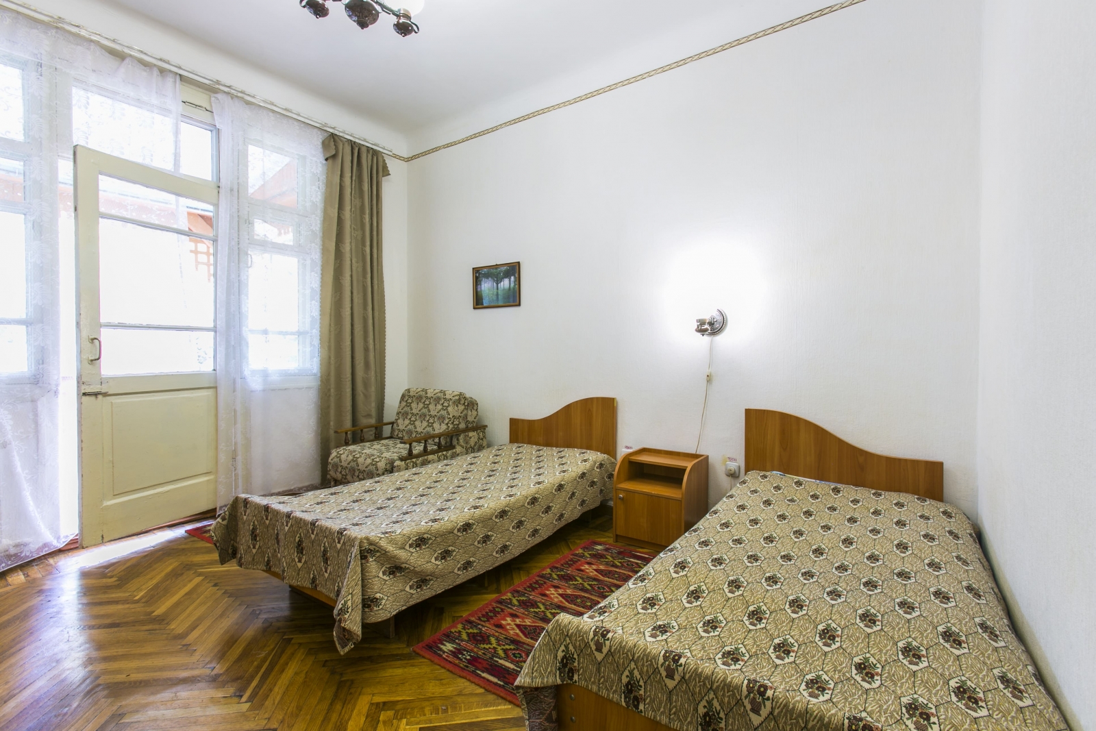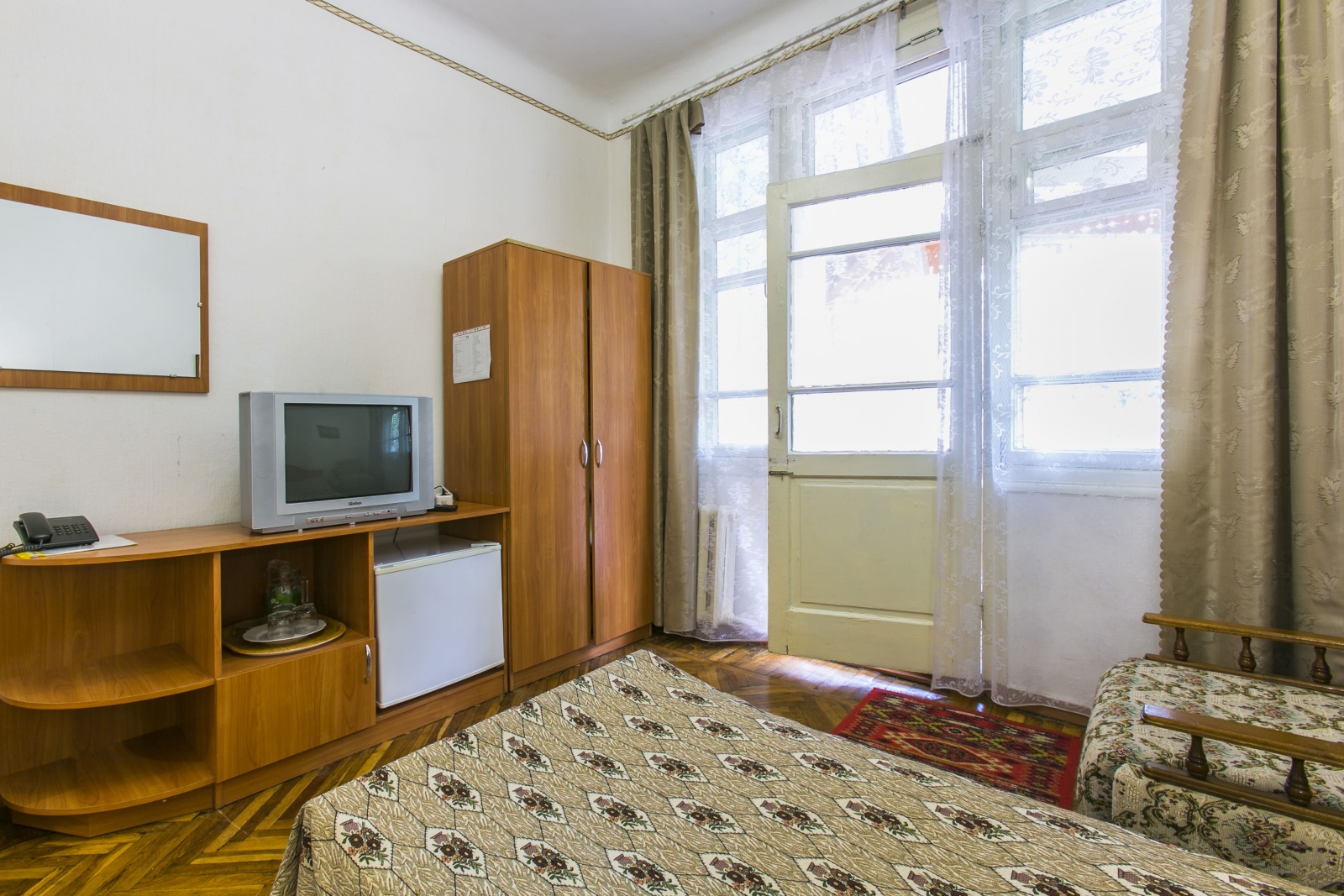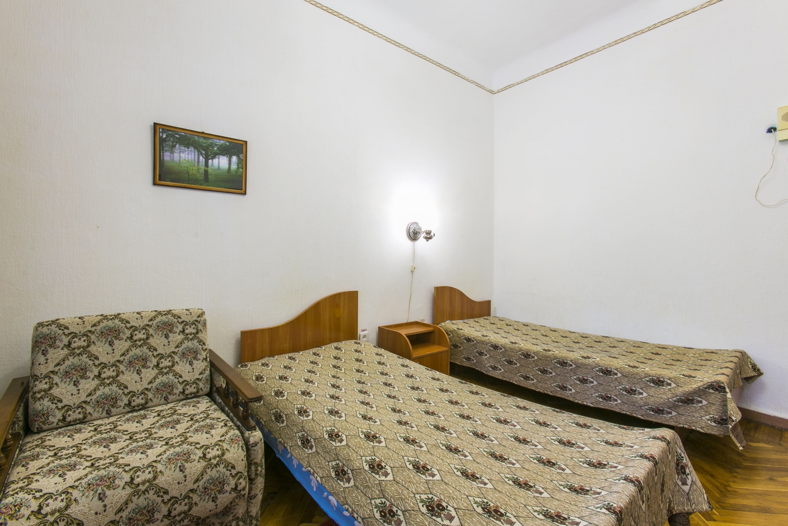 Площадь номера - 12,5 кв.м. 2 осн. места. 1 доп. место. Балкон. Мебель: кресло, кровати односпальные, прикроватные тумбочки, стол, стулья, шкаф. Оборудование: телевизор, холодильник. Санузел. Сервис: смена полотенец, смена постельного белья, уборка номера.